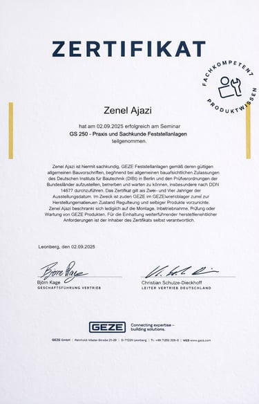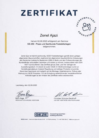 Zenel Ajazi hat erfolgreich am Seminar „GS 250 – Praxis und Sachkunde Feststellanlagen“ teilgenommen und ist qualifiziert, GEZE Feststellanlagen gemäß den geltenden bauaufsichtlichen Vorschriften zu montieren, in Betrieb zu nehmen, zu prüfen und zu warten – einschließlich der Durchführung von Prüfungen nach DIN 14677.
